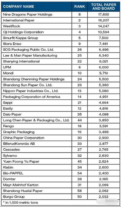 最新一期出版的美國paper360雜志根據2021年(部分企業為財年)企業紙漿、紙張、加工和貿易(PPCM)業務的凈銷售額為依據,公布了最新的全球紙業75強名單。 前10名企業分別是美國的P&G、International Paper、WestRock,日本的Oji,愛爾蘭的Smurfit Kappa,芬蘭的UPM,英國的DS Smith,中國的玖龍紙業,芬蘭的Stora Enso和南非的Mondi。 根據排名的規則,前75名是必須披露財務業績的上市公司。Georgia-Pacific、APP、Kruger、Irving、SustanAPRI等非上市公司不在本次排名中。 本次排名有兩個里程碑式的變化: No.1易主 連續多年排名第一的美國International Paper被P&G超過,2021年International Paper進行了業務重組,文化紙等業務成立了新公司Sylvamo,從International Paper剝離。 中國企業進入全球十強 玖龍紙業成為第一家進入全球造紙行業前十強的中國企業,2021年營業收入為9547.9百萬美元,同比增長19.9%! 報告還公布了全球32家紙及紙板產量(產能)超過200萬噸的造紙企業名單,中國玖龍紙業紙及紙板產量1760萬噸,超過International Paper,成為全球紙及紙板產量最大的企業,International Paper和WestRock位列二、三位。理文造紙和山鷹國際進入了紙和紙板產量全球前十名,分列第八和第九位。中國還有六家企業進入這個名單,依次分別是晨鳴紙業、太陽紙業、榮成、中國紙業、永豐余和華泰紙業。