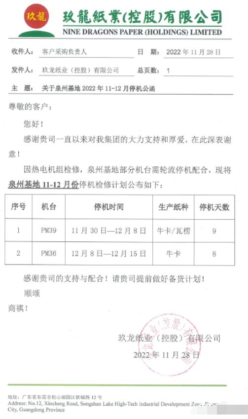 除了玖龍紙業外,山鷹國際也在12月4日發布了停機函,但所涉及的基地更多、時間更長。 按照往年慣例,紙企停機函到來后,緊接的就將是漲價通知,然而由于今年的“詭異”行情,紙企這一“套路”卻幾度未曾見效。在距離春節僅有一個多月的當下,在原紙降價、廢紙下跌的行情下,紙企能否沖出桎梏上演一波“絕地反彈”? 目前來看,難度不小。一方面,正如臺灣媒體對大陸紙業市場停機檢修現象而評論的那般:“這顯示出需求端欲振乏力,今年的最后希望春節旺季恐再度落空。”另一方面,下游包裝市場觀望濃厚,包裝企業按需采購,難以對紙價上漲提供支撐。 當然,市場終究是千變萬化的,很難完全預測,萬一紙企就在春節前來一波上漲,也說不定。總之,下游包裝企業根據自身庫存和訂單情況,謹慎判斷市場行情吧。