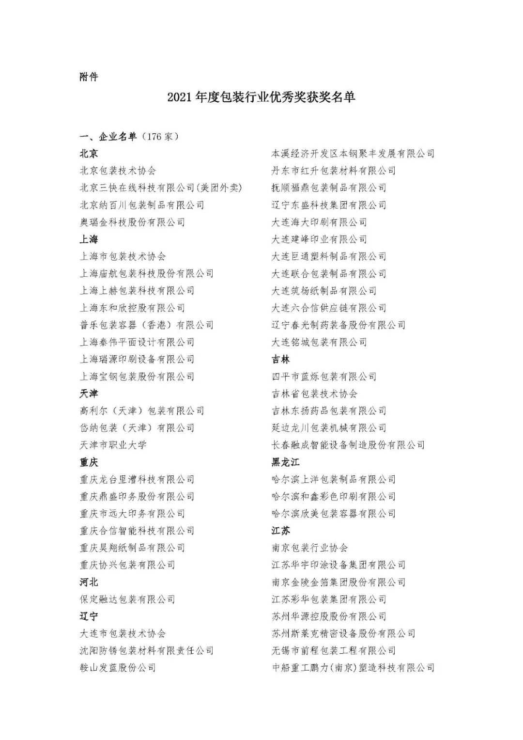 為推進我國包裝行業企業現代化發展,加快建設包裝強國,推動行業高質量發展。根據《全國評比達標表彰保留項目目錄》及《包裝行業優秀獎評選表彰管理辦法》要求,中國包裝聯合會組織開展了2021年度包裝行業優秀獎評選工作。