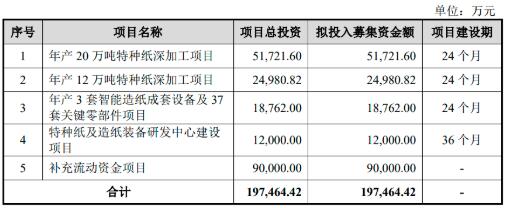 江河紙業本次IPO擬發行股份不超過6880萬股,占發行后總股本的比例不低于25.00%;擬募集資金19.75億元,主要用于年產20萬噸特種紙深加工項目、年產12萬噸特種紙深加工項目、年產3套智能造紙成套設備及37套關鍵零部件項目、特種紙及造紙裝備研發中心建設項目和補充流動資金項目。