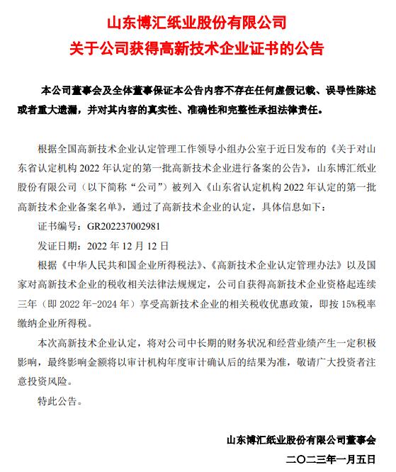 根據全國高新技術企業認定管理工作領導小組辦公室于近日發布的《關于對山東省認定機構2022年認定的第一批高新技術企業進行備案的公告》,山東博匯紙業股份有限公司被列入《山東省認定機構2022年認定的第一批高新技術企業備案名單》,通過了高新技術企業的認定。