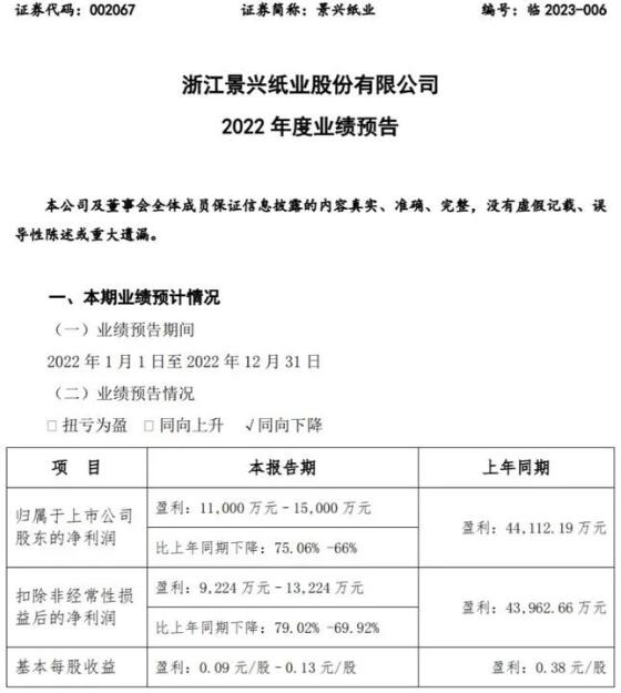 景興紙業(yè)(002067)近日發(fā)布2022年年度業(yè)績預(yù)告,報告期內(nèi)歸屬于上市公司股東的凈利潤11,000萬元-15,000萬元,比上年同期下降75.06%-66%;基本每股收益0.09元/股-0.13元/股。