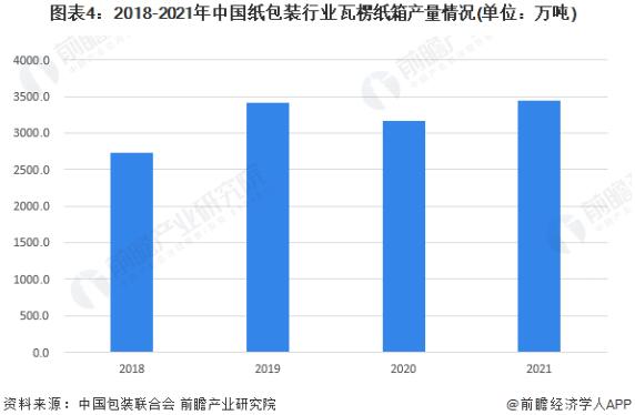 瓦楞紙箱是最主要的包裝紙制品,根據中國包裝聯合會數據,2018-2021年中國紙包裝行業瓦楞紙箱產量呈波動增長態勢,2021年產量規模達到3444.20萬噸,同比增長8.62%。