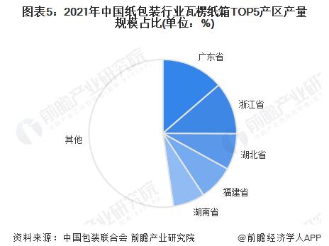 中國瓦楞紙箱產量前五大省市依次是廣東省、浙江省、湖北省、福建省、湖南省,前五大省市產量規模合計占比47.71%。其中,廣東省2021年產量達到1057.93萬噸,占據全國13.67%,產量規模位居全國第一。