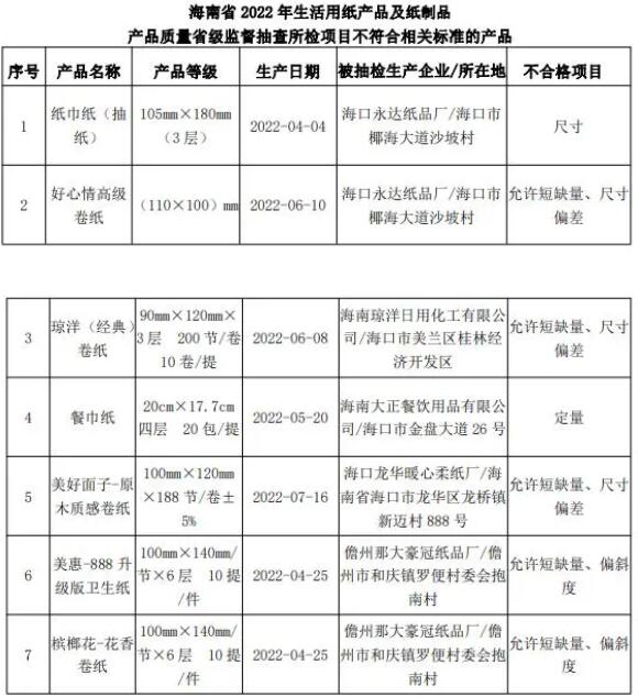 不合格產品涉及抽樣自?谟肋_紙品廠的1批次紙巾紙(抽紙)、1批次好心情高級卷紙;抽樣自海南瓊洋日用化工有限公司的1批次瓊洋(經典)卷紙;抽樣自海南大正餐飲用品有限公司的1批次餐巾紙等。不合格項目為:衛生紙的“尺寸偏差”、“偏斜度”、“允許短缺量”和紙巾紙的“尺寸”、“定量”。
