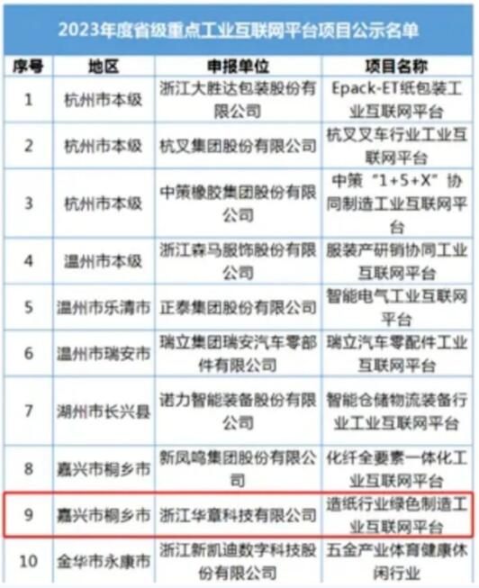 近日,浙江省經信廳公示了2023年度省級重點工業互聯網平臺名單,浙江華章科技有限公司的“造紙行業綠色制造工業互聯網平臺”成功上榜。