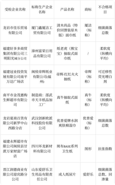 據公告,福建省市場監督管理局組織對紙制品產品開展產品質量省級監督抽查。本次共抽查紙巾紙50批次、濕巾25批次、衛生巾、衛生護墊30批次、紙尿褲30批次、衛生紙20批次、成人紙尿褲10批次,共抽查了165批次,其中7批次不合格。本次抽查發現不合格指標主要是細菌菌落總數、可遷移性熒光增白劑、吸收速度、甲醛含量、可分解致癌芳香胺染料、回滲量。