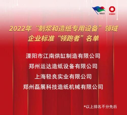 溧陽市江南烘缸制造有限公司、鄭州運達造紙設備有限公司、上海輕良實業有限公司、鄭州磊展科技造紙機械有限公司等4家企業在公示期無異議后分別榮獲鋼制烘缸、壓力篩、衛生紙機、鼓式碎漿機2022年企業標準“領跑者”。
