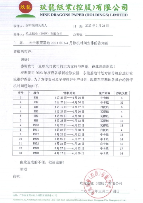 (東莞玖龍2-3月份停機計劃) 這是東莞玖龍紙業自開年以后的第二輪大規模停機計劃,2-3月份,該基地就已有11臺紙機輪流停產3-16天。對比兩份停機通知函可以發現,大多數紙機如PM1、PM2、PM6、PM7、PM9、PM10、PM12、PM19、PM32在2-3月份參與停機后,3-4月將繼續停機數日。