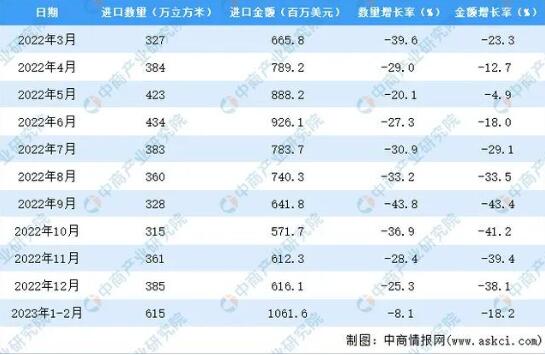 據(jù)中商產業(yè)研究院數(shù)據(jù)庫顯示,2022年我國原木的進口量下降明顯,降至4370萬立方米,同比減少31.3%。最新數(shù)據(jù)顯示,2023年1-2月中國原木進口量615萬立方米,同比減少8.1%。