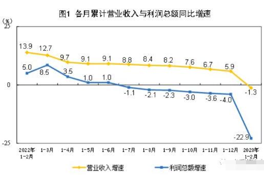 3月27日,國家統計局公布了2023年1-2月份全國規模以上工業企業利潤情況。數據顯示,全國規模以上工業企業在1-2月份共實現利潤總額8872.1億元,同比下降22.9%。