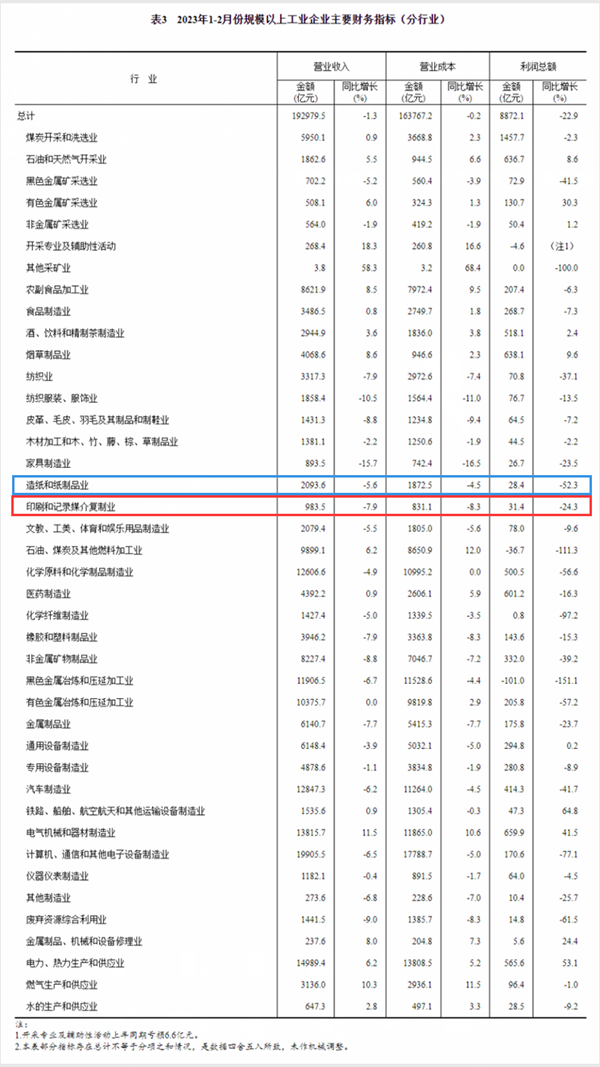 2023年1-2月份,在41個工業大類行業中,10個行業利潤總額同比增長,1個行業減虧,28個行業下降,2個行業由盈轉虧。其中,造紙和紙制品業實現利潤總額28.4億元,同比下降52.3%;印刷和記錄媒介復制業實現利潤總額31.4億元,同比下降24.3%。 在營業收入方面,2023年1-2月份,全國規模以上工業企業實現營業收入19.30萬億元,同比下降1.3%。其中,造紙和紙制品業實現營業收入2093.6億元,同比下降5.6%;印刷和記錄媒介復制業營業收入983.5億元,同比下降7.9%。