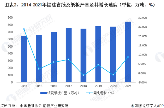 福建省紙制品包裝政策發(fā)展環(huán)境 2021年7月,福建省發(fā)布《福建省“十四五”制造業(yè)高質(zhì)量發(fā)展專項規(guī)劃》,規(guī)劃中明確突出特色化、流派化發(fā)展,著力推動福建傳統(tǒng)工藝振興,提升工藝美術(shù)、家裝日用品、造紙及紙制品等。到2025年,全省特色輕工產(chǎn)業(yè)規(guī)模達(dá)到5500億元。以泉州、漳州為重點(diǎn),打造紙及紙制品產(chǎn)業(yè)集群,引導(dǎo)恒安、玖龍、聯(lián)盛、青山紙業(yè)等企業(yè)加強(qiáng)自主創(chuàng)新能力建設(shè),提升設(shè)計集成能力和生產(chǎn)工藝技術(shù)裝備水平。重點(diǎn)提高生活用紙、包裝用紙及紙板、特種紙及紙板的產(chǎn)品質(zhì)量,優(yōu)化品種結(jié)構(gòu),研發(fā)制漿造紙纖維資源綜合利用和循環(huán)利用技術(shù),推動資源能源高效合理利用。 2021年福建省紙及紙板產(chǎn)量為845萬噸 根據(jù)中國造紙協(xié)會統(tǒng)計數(shù)據(jù)顯示,2014年以來,福建省紙及紙板產(chǎn)量穩(wěn)居全國前列。2014-2020年,福建省紙及紙板產(chǎn)量總體呈現(xiàn)波動增長變化趨勢。2021年,全省紙及紙板產(chǎn)量為845萬噸,相比上年增加8.75%。2021年福建省紙及紙板產(chǎn)量占全國紙及紙板總產(chǎn)量的比重為7.28%,排名第五。