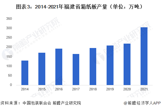 2021年福建省箱紙板產(chǎn)量為306.19萬噸 受益于上游造紙行業(yè)發(fā)展優(yōu)勢,福建省在紙制品包裝領(lǐng)域處于全國領(lǐng)先地位。根據(jù)中國包裝聯(lián)合會數(shù)據(jù)統(tǒng)計,2014-2021年,福建省箱紙板產(chǎn)量總體呈現(xiàn)波動上升趨勢。2021年,福建省箱紙板產(chǎn)量達(dá)306.19萬噸,同比增長18.22%,為近年來新高。2021年福建省箱紙板產(chǎn)量占全國箱紙板總產(chǎn)量的18.22%,排名第一。