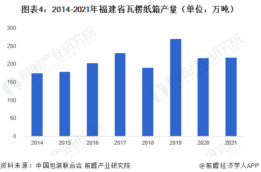 2021年福建省瓦楞紙箱產(chǎn)量為218.67萬噸 瓦楞紙箱方面,根據(jù)中國包裝聯(lián)合會數(shù)據(jù)統(tǒng)計,2014年以來,福建省瓦楞紙箱產(chǎn)量呈現(xiàn)波動上升的態(tài)勢,2014年福建省瓦楞紙箱產(chǎn)量為175.8噸,到2021年,福建省瓦楞紙箱產(chǎn)量已達(dá)218.67萬噸。2020年福建省瓦楞紙箱產(chǎn)量占全國瓦楞紙箱總產(chǎn)量的6.35%,排名第六。