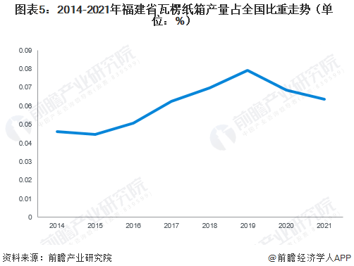 福建省紙制品包裝行業(yè)地位分析 根據(jù)中國包裝聯(lián)合會數(shù)據(jù)統(tǒng)計,2014-2019年,福建省瓦楞紙箱產(chǎn)量占全國比重整體呈現(xiàn)上升趨勢;2015年,福建省瓦楞紙箱產(chǎn)量占全國比重降至近年最低點(diǎn),為4.46%,隨后開始持續(xù)提升,近兩年來有所回落。2021年,福建省瓦楞紙箱產(chǎn)量占全國比重為6.35%,排名第六。