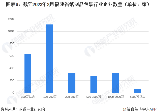 福建省紙制品包裝行業(yè)企業(yè)數(shù)量接近6000家 截至2023年3月,福建省紙制品包裝行業(yè)企業(yè)數(shù)量共有2722家,其中注冊資本為100-200萬之間的企業(yè)數(shù)量最高,達(dá)到1112家,占比超過40%。注冊資本在100萬之以內(nèi)紙制品包裝企業(yè)數(shù)量為628家。注冊資本超過500萬的企業(yè)約占25%。