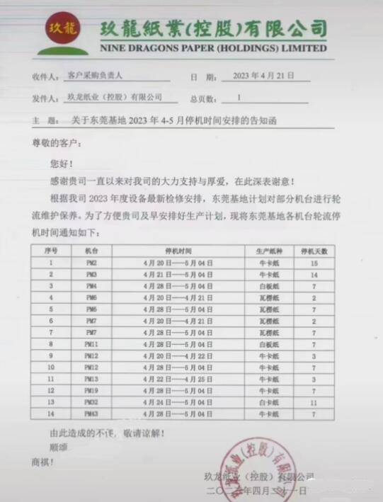 東莞玖龍紙業最新停機計劃來襲!4月21日,東莞玖龍紙業發布4-5月停機時間安排,11臺紙機將在4月20日-5月4日期間輪流停機2-15天,涉及?ā⑼呃、白板、白卡等包裝紙類。