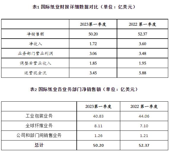 ●國際紙業(yè)2023年第一季度凈銷售額50.2 億美元,相比去年同期下降了4.1%;