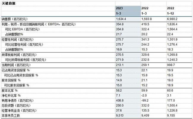 2023 年 1-3 月(2022年1-3月同比數(shù)據(jù)) ·銷售額為 16.34 億歐元(同比:15.94 億歐元) ·經(jīng)營性利潤為 2.76 億歐元(同比:3.41 億歐元);可比經(jīng)營性利潤為 2.76 億歐元(同比:2.44 億歐元) ·稅前利潤為 2.71 億歐元(同比:3.3 億歐元);可比稅前利潤為 2.72 億歐元(同比:2.32 億歐元) ·可比已占用資本回報率為 15.3%(同比:15.8%) ·經(jīng)營性凈現(xiàn)金流為 0.38 億歐元(同比:1.35 億歐元) 2023 年第一季度主要事件 ·芬林集團(tuán)長纖漿的平均銷售價格環(huán)比下降。 ·芬林紙板調(diào)整了生產(chǎn)以匹配需求。由于消費(fèi)品需求下降以及價值鏈庫存調(diào)整,對紙板的需求有所下降。 ·芬林紙板的紙板產(chǎn)品平均價格上漲。 ·今年2月,芬林生活用紙對其瑞典瑪麗斯塔德生活用紙廠做出投資決定,該項目投資額約為 3.7 億歐元。 ·芬林集團(tuán)遵循再生林業(yè)原則,其目標(biāo)是確保芬蘭的森林資產(chǎn)在更具生命力、生物多樣性更為豐富,以及對氣候變化產(chǎn)生更為積極和可持續(xù)影響的條件下代代相傳。 ·芬林集團(tuán)和富騰集團(tuán)展開合作,旨在利用林業(yè)產(chǎn)生的木基二氧化碳作為化工原料。 ·芬林集團(tuán)修訂了其 2030 年可持續(xù)發(fā)展目標(biāo)。 ·芬林之春投資初創(chuàng)企業(yè)Fiberwood,該公司以林業(yè)副產(chǎn)物為原料,開發(fā)新型隔熱材料。 2023 年 4-6 月的業(yè)績展望 芬林集團(tuán) 2023 年 4-6 月的可比經(jīng)營性利潤預(yù)計將低于 2023 年 1-3 月。 芬林集團(tuán)總裁兼首席執(zhí)行官何亦凱(Ilkka Hämälä)表示: 正如預(yù)期,芬林集團(tuán) 2023 年第一季度的業(yè)績?nèi)跤谏弦患径龋员憩F(xiàn)出色。芬林梅沙木業(yè)和芬林生活用紙的季度業(yè)績創(chuàng)下新高。芬林紙板的紙板業(yè)務(wù)表現(xiàn)一如預(yù)期。芬林芬寶和芬林紙板的木漿業(yè)務(wù)領(lǐng)域,市場放緩速度快于預(yù)期,導(dǎo)致芬林紙板的業(yè)績表現(xiàn)低于預(yù)期。 盡管芬林集團(tuán)取得了較高的業(yè)績,但歐洲疲軟的經(jīng)濟(jì)前景和高通脹對我們所有的業(yè)務(wù)領(lǐng)域都產(chǎn)生了顯著影響。在木制品業(yè),需求反映出建筑行業(yè)新項目正在減少。不斷上漲的消費(fèi)價格影響了零售活動,并進(jìn)一步影響了對生活用紙和包裝材料的需求。在歐洲和亞洲,因造紙企業(yè)減產(chǎn),導(dǎo)致年初木漿供應(yīng)過剩。盡管市場蔓延謹(jǐn)慎情緒,但在我們的產(chǎn)品細(xì)分市場,仍保持需求長期強(qiáng)勁的前景預(yù)期,我們在主要市場領(lǐng)域的競爭力依舊處于優(yōu)勢地位。 芬林集團(tuán)的各個開發(fā)項目正在按計劃進(jìn)行。在凱米生物制品廠,試運(yùn)行已逐步啟動,安裝工作也在同時進(jìn)行。芬蘭凱米生物制品廠和芬林紙板凱米牛卡紙板廠的一體化擴(kuò)建將于第三季度得以部署。瑞典胡蘇姆紙板廠的折疊紙板20萬噸新增產(chǎn)能項目在第四季度投產(chǎn)。芬林生活用紙已啟動對瑞典瑪麗斯塔德生活用紙廠的投資,預(yù)計在 2025 年初引入新的生活用紙機(jī)和相關(guān)的加工生產(chǎn)線 。芬林梅沙木業(yè)位于艾內(nèi)科斯基的Kerto LVL單板層積材工廠已于 4 月獲得環(huán)評許可證,已具備條件進(jìn)入投資決策環(huán)節(jié)。