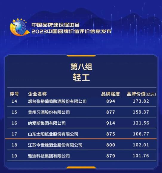 5月11日,2023世界品牌莫干山大會期間,中國品牌建設(shè)促進(jìn)會聯(lián)合有關(guān)權(quán)威單位共同發(fā)布2023中國品牌價值評價信息。其中,山東太陽紙業(yè)股份有限公司品牌價值為106.77億元,品牌強(qiáng)度為875,位列輕工組第17位。