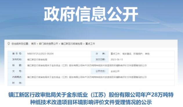 2023年6月13日,鎮江新區行政審批局受理了金東紙業(江蘇)股份有限公司年產28萬噸特種紙技術改造項目環境影響評價文件。該項目已獲得了鎮江新區行政審批局的備案。