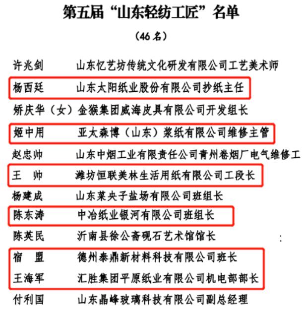 2023年6月25日,省輕紡工會下發《關于公布第五屆“山東輕紡工匠”的通知》,公布了第五屆“山東輕紡工匠”名單。協會6家會員企業一線員工獲此殊榮,分別是山東太陽紙業股份有限公司抄紙主任 楊西廷、亞太森博(山東)漿紙有限公司維修主管 姬中用、濰坊恒聯美林生活用紙有限公司工段長 王帥、中冶紙業銀河有限公司班組長 陳東濤、德州泰鼎新材料科技有限公司班長 宿盟和匯勝集團平原紙業有限公司機電部部長 王海軍,協會代表會員單位向以上6名“山東輕紡工匠”表示熱烈祝賀。