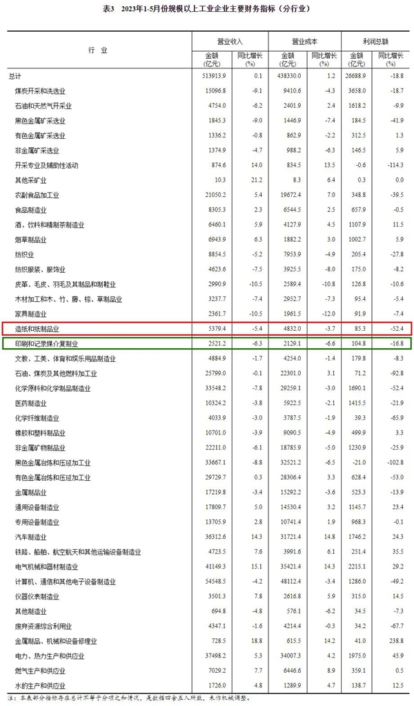1—5月份,在41個工業大類行業中,14個行業利潤總額同比增長,1個行業持平,24個行業下降,2個行業由盈轉虧。主要行業利潤情況如下:電力、熱力生產和供應業利潤總額同比增長45.9%,電氣機械和器材制造業增長29.2%,汽車制造業增長24.3%,通用設備制造業增長23.4%,專用設備制造業下降0.1%,石油和天然氣開采業下降9.9%,煤炭開采和洗選業下降18.7%,非金屬礦物制品業下降25.9%,紡織業下降27.8%,農副食品加工業下降39.5%,計算機、通信和其他電子設備制造業下降49.2%,化學原料和化學制品制造業下降52.4%,有色金屬冶煉和壓延加工業下降53.0%,石油、煤炭及其他燃料加工業下降92.8%,黑色金屬冶煉和壓延加工業由盈利轉為虧損。 值得關注的是,造紙和紙制品業實現利潤總額85.3億元,同比下降52.4%;印刷和記錄媒介復制業實現利潤總額104.8億元,同比下降16.8%。