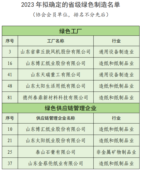 2023年7月18日,山東省工業和信息化廳公示了2023年省級綠色制造名單,擬確定105家企業為省級綠色工廠,10家園區為省級綠色工業園區,41家企業為綠色供應鏈管理企業。其中,山東省造紙行業協會會員單位:山東太陽生活用紙有限公司、山東博匯紙業股份有限公司、德州泰鼎新材料科技有限公司、山東省章丘鼓風機股份有限公司和山東天瑞重工有限公司入選省級“綠色工廠”,山東博匯紙業股份有限公司、山東太陽紙業股份有限公司、山東金蔡倫紙業有限公司和泰山石膏有限公司入選省級“綠色供應鏈管理企業”。