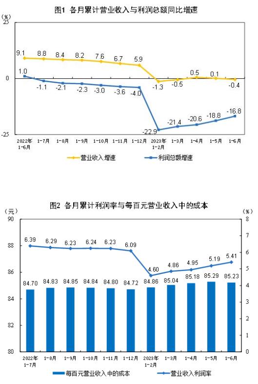 1—6月份,規(guī)模以上工業(yè)企業(yè)實(shí)現(xiàn)營業(yè)收入62.62萬億元,同比下降0.4%;發(fā)生營業(yè)成本53.37萬億元,增長0.5%;營業(yè)收入利潤率為5.41%,同比下降1.07個(gè)百分點(diǎn)。其中,造紙和紙制品業(yè)實(shí)現(xiàn)營業(yè)收入6523.9億元,同比下降5.5%;印刷和記錄媒介復(fù)制業(yè)實(shí)現(xiàn)營業(yè)收入3044.6億元,同比下降6.6%。 6月末,規(guī)模以上工業(yè)企業(yè)資產(chǎn)總計(jì)160.31萬億元,同比增長6.6%;負(fù)債合計(jì)92.28萬億元,增長6.7%;所有者權(quán)益合計(jì)68.04萬億元,增長6.3%;資產(chǎn)負(fù)債率為57.6%,同比上升0.1個(gè)百分點(diǎn)。 6月末,規(guī)模以上工業(yè)企業(yè)應(yīng)收賬款22.72萬億元,同比增長10.6%;產(chǎn)成品存貨6.05萬億元,增長2.2%。 1—6月份,規(guī)模以上工業(yè)企業(yè)每百元營業(yè)收入中的成本為85.23元,同比增加0.81元;每百元營業(yè)收入中的費(fèi)用為8.34元,同比增加0.25元。 6月末,規(guī)模以上工業(yè)企業(yè)每百元資產(chǎn)實(shí)現(xiàn)的營業(yè)收入為79.1元,同比減少6.2元;人均營業(yè)收入為173.6萬元,同比增加5.1萬元;產(chǎn)成品存貨周轉(zhuǎn)天數(shù)為20.3天,同比增加1.1天;應(yīng)收賬款平均回收期為63.2天,同比增加6.4天。 6月份,規(guī)模以上工業(yè)企業(yè)實(shí)現(xiàn)利潤總額7197.6億元,同比下降8.3%。 國家統(tǒng)計(jì)局工業(yè)司統(tǒng)計(jì)師孫曉解讀工業(yè)企業(yè)利潤數(shù)據(jù)表示,今年以來,隨著推動經(jīng)濟(jì)持續(xù)回升向好各項(xiàng)政策措施落地顯效,工業(yè)生產(chǎn)穩(wěn)步恢復(fù),企業(yè)盈利逐月改善,工業(yè)企業(yè)效益狀況呈現(xiàn)以下主要特點(diǎn):工業(yè)企業(yè)利潤穩(wěn)步恢復(fù)。七成以上行業(yè)盈利較一季度改善,制造業(yè)盈利改善明顯。裝備制造業(yè)累計(jì)利潤增速由負(fù)轉(zhuǎn)正。消費(fèi)品制造業(yè)利潤加快回升。電氣水行業(yè)利潤持續(xù)增長。不同類型企業(yè)利潤均有改善,小型、私營、外資企業(yè)改善明顯。企業(yè)單位成本邊際改善,利潤率環(huán)比回升。總體看,工業(yè)企業(yè)利潤延續(xù)恢復(fù)態(tài)勢。