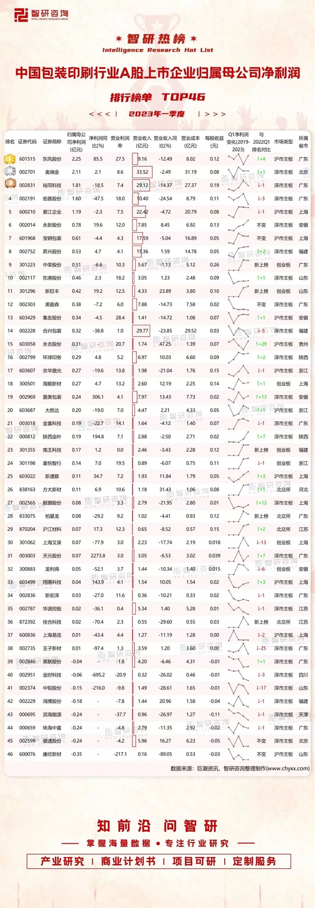46家包裝印刷A股上市企業(yè)2023年第一季度總計歸屬母公司凈利潤為14.88億元,同比增長0.53%(截至2022年5月15日,2022Q1共有41家包裝印刷上市企業(yè)公布數(shù)據(jù),總計歸屬母公司凈利潤為14.8億元),總計營收275.4億元。