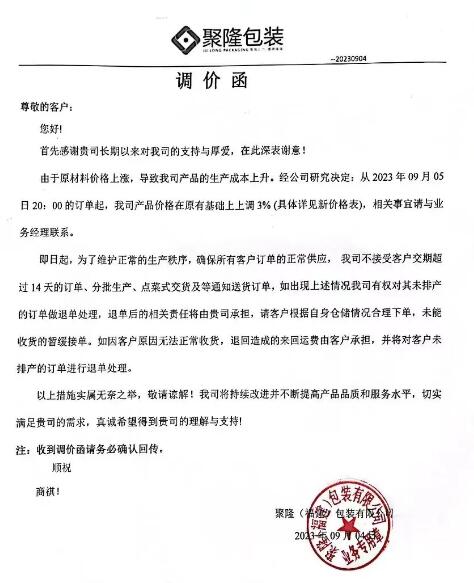 聚隆包裝:由于原材料價(jià)格上漲,導(dǎo)致我司產(chǎn)品的生產(chǎn)成本上升,從9月5日起我司產(chǎn)品價(jià)格上調(diào)3%。