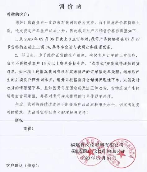 福建省文松彩印有限公司:9月5日起價(jià)格上調(diào)3%。