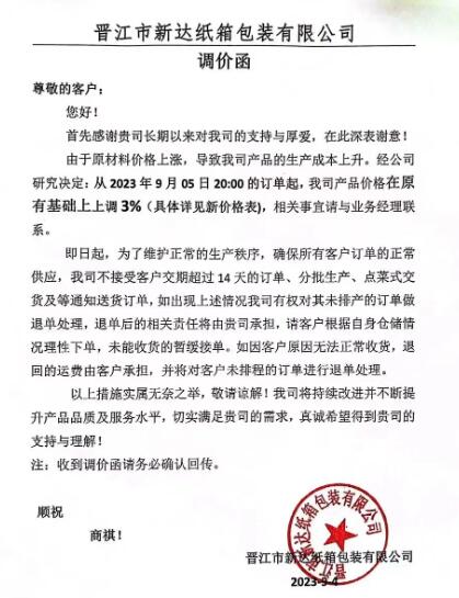 晉江市新達(dá)紙箱包裝有限公司:由于原材料價(jià)格上漲,導(dǎo)致我司產(chǎn)品的生產(chǎn)成本上升,從9月5日起價(jià)格上調(diào)3%。