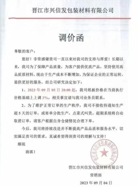 晉江市興信發(fā)包裝材料有限公司:9月5日起我司紙板價(jià)格上調(diào)3%。