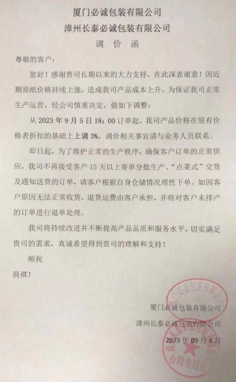 廈門(mén)必誠(chéng)包裝有限公司/漳州長(zhǎng)泰必誠(chéng)包裝有限公司:9月5日起價(jià)格上調(diào)3%。