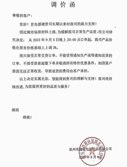 泉州市駿程包裝有限公司:9月5日起產(chǎn)品價(jià)格上調(diào)3%。