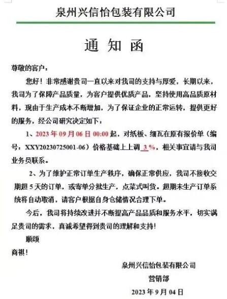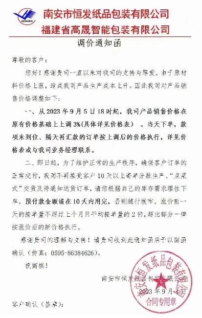 南安市恒發(fā)紙品包裝有限公司:9月5日起,產(chǎn)品價(jià)格上調(diào)3%。