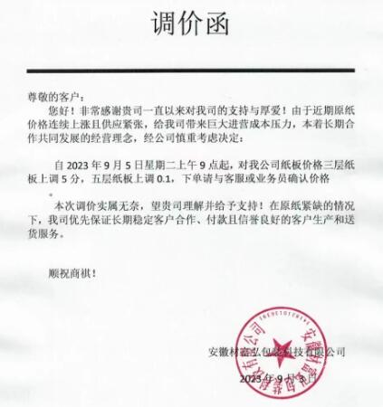 安徽材富弘包裝科技有限公司:9月5日起,三層紙板價(jià)格上調(diào)5分,五層紙板價(jià)格上調(diào)0.1.
