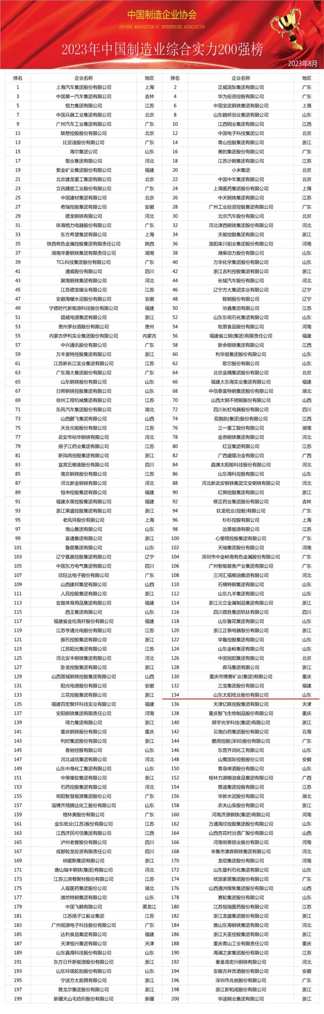 近日,2023年中國制造業(yè)綜合實(shí)力200強(qiáng)暨中國裝備制造業(yè)100強(qiáng)排行榜發(fā)布,太陽紙業(yè)榮登榜單,位列第134位。