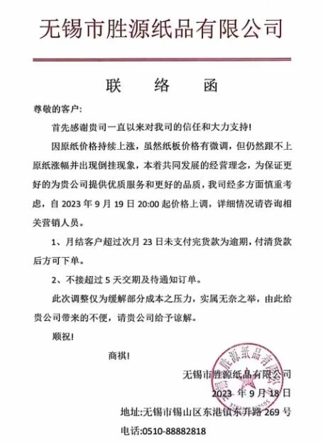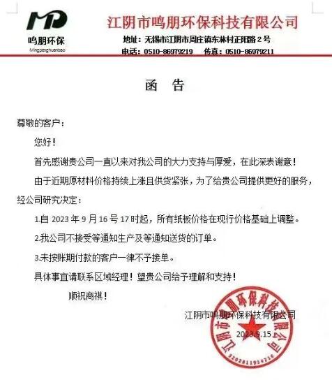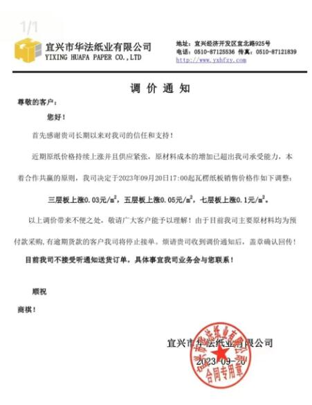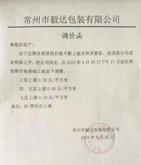 紙板廠最新漲價信息: