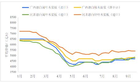 圖1 2023年1—9月河北進(jìn)口木漿和廣西進(jìn)口及國(guó)產(chǎn)木漿平均價(jià)格變化趨勢(shì)