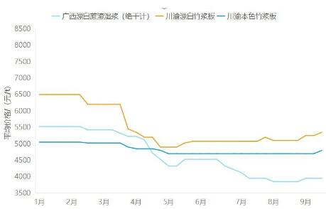 圖2 2023年1—9月川渝竹漿和廣西漂白蔗渣漿平均價(jià)格變化趨勢(shì) 從各類(lèi)紙漿價(jià)格變化曲線,以及國(guó)內(nèi)市場(chǎng)目前紙漿的供應(yīng)情況來(lái)分析,木漿和非木漿價(jià)格變化存在一定的相關(guān)性。非木漿價(jià)格一定程度上受到木漿價(jià)格變化的影響,當(dāng)木漿價(jià)格上漲時(shí),非木漿也呈現(xiàn)不同程度的上漲,但值得注意的是,本色竹漿由于需求減少,2023年以來(lái)至今價(jià)格一直相對(duì)較為穩(wěn)定。 2023年9月,河北漂白闊葉木漿板(進(jìn)口)平均價(jià)格4825元/t、河北漂白針葉木漿板(進(jìn)口)平均價(jià)格5563元/t、廣西漂白闊葉木漿板(進(jìn)口)平均價(jià)格4700元/t、廣西本地漂白桉木濕漿(絕干計(jì))平均價(jià)格約4800元/t,較2023年8月均有所上漲。 非木漿中,川渝漂白竹漿平均價(jià)格約5400元/t,較2023年8月(5100元/t)上漲300元/t;本色竹漿平均價(jià)格約4763元/t,較2023年8月(4700元/t)略有上漲。廣西漂白蔗渣濕漿(絕干計(jì))平均價(jià)格約3950元/t,較2023年8月(3850元/t)上漲100元/t。具體變化情況見(jiàn)表1。