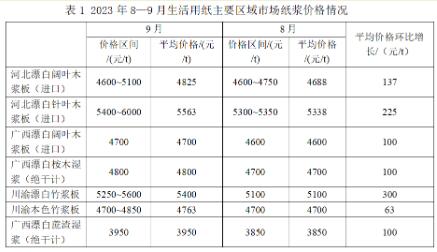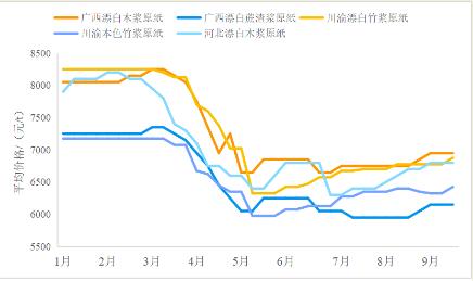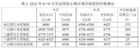 圖3 2023年1—9月生活用紙?jiān)埑鰪S平均價(jià)格變化趨勢(shì) 原紙價(jià)格9月情況,河北漂白木漿原紙平均價(jià)格約6800元/t,較2023年8月上漲約175元/t。廣西漂白木漿原紙平均價(jià)格約6975元/t,較2023年8月均上漲約200元/t。 川渝漂白竹漿原紙平均價(jià)格約6900元/t,較2023年8月(6756元/t)上漲144元/t;本色竹漿原紙平均價(jià)格約6400元/t,較2023年8月(6375元/t)略有上漲。 廣西漂白蔗渣漿原紙平均價(jià)格約6150元/t,較2023年8月(5975元/t)上漲175元/t。具體情況見(jiàn)表2。 受漿價(jià)上行影響,預(yù)計(jì)原紙價(jià)格短期內(nèi)仍將呈上漲趨勢(shì)。