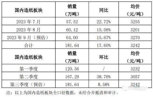 整體來看,無論是造紙和紙制品業還是印刷和記錄媒介復制業,其運營情況正逐步好轉。這一點也體現在企業的經營上。 近期,造紙和紙制品業龍頭紙企山鷹國際發布了第三季度國內造紙板塊經營數據,經營情況環比改善。數據顯示,山鷹國際8月份銷量為60.12萬噸,同比增長15.06%;預計9月份銷量為64萬噸,同比增長15.67%。一季度總銷量為120.56萬噸,二季度總銷量為167.29萬噸,環比增長38.76%;預計三季度銷量為181.64萬噸,預計環比增長8.58%。