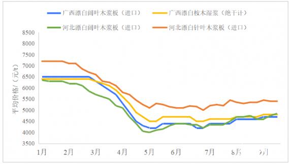 圖1 2023年1—9月河北進口木漿和廣西進口及國產木漿平均價格變化趨勢