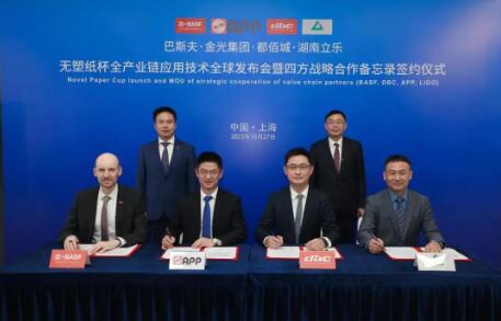 無(wú)塑紙杯技術(shù)全球發(fā)布會(huì)于10月27日在上海成功舉辦,標(biāo)志著巴斯夫BASF、金光集團(tuán)APP、都佰城及湖南立樂(lè)四家企業(yè)強(qiáng)強(qiáng)聯(lián)手,共同推動(dòng)無(wú)塑紙杯技術(shù)的全球發(fā)展并達(dá)成了戰(zhàn)略合作關(guān)系。