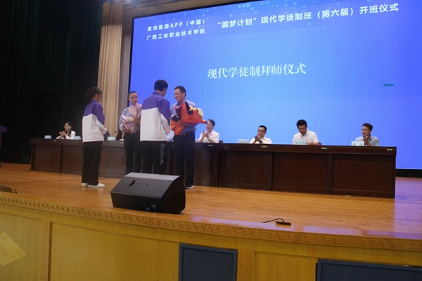 2023年11月2日上午,金光集團(tuán)APP(中國)第六屆“圓夢(mèng)計(jì)劃”現(xiàn)代學(xué)徒制班開學(xué)典禮在廣西工業(yè)職業(yè)技術(shù)學(xué)院圓滿舉辦。在當(dāng)天的開學(xué)典禮上,學(xué)徒班的學(xué)生代表還按照傳統(tǒng)拜師禮儀進(jìn)行拜師禮,向金光集團(tuán)旗下的欽州工廠技師敬拜師茶、行拜師禮。