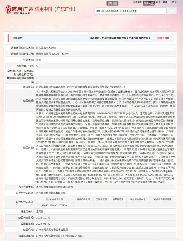 近日,信用中國(廣東廣州)網站發布行政處罰信息【行政處罰決定書文號:穗天市監處罰〔2023〕877號】,涉及廣州粵成包裝制品有限公司。該公司提交虛假資料取得公司登記被處罰。