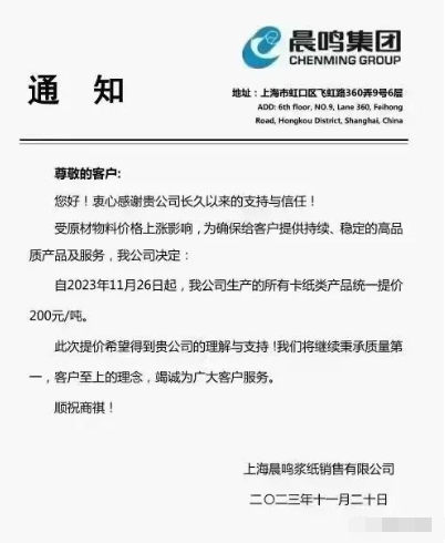 上海晨鳴漿紙銷售有限公司:自2023年11月26日起,我公司生產(chǎn)的所有卡紙類產(chǎn)品統(tǒng)一提價200元/噸